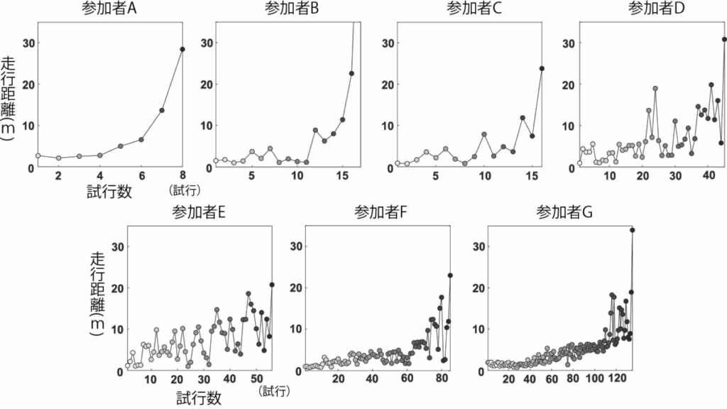 図2 7名の参加者の試行数(横軸)と走行距離(縦軸)を表したもの.学習基準(2周約20m)を早く達成した順に並べてあります.