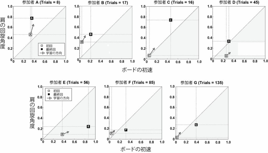 図3 7名の参加者のボードの初速と肩の回旋角度の関係を1回目と最終回の試行で表したもの.上段が比較的早く学習した人たちで,下段が学習に比較的時間を要した人たち.対角線よりも上は肩の回旋が初速よりも大きいこと,下は初速の方が肩の回旋よりも大きいことを示します.