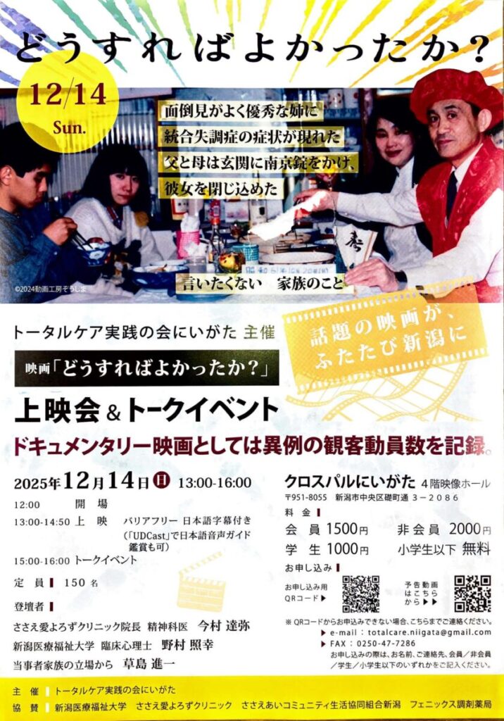 全国各地で大きな反響を呼んでいるドキュメンタリー映画「どうすればよかったか?」の上映会とトークイベントが,新潟市で開催されます.